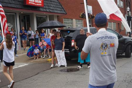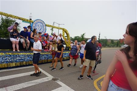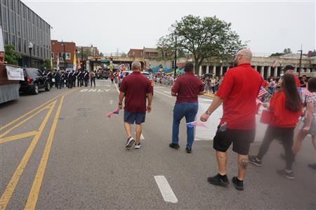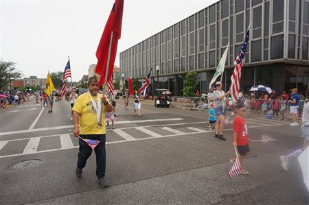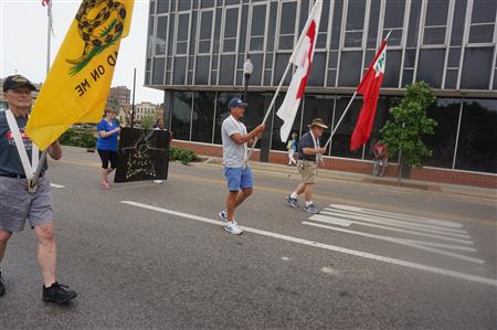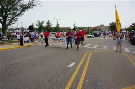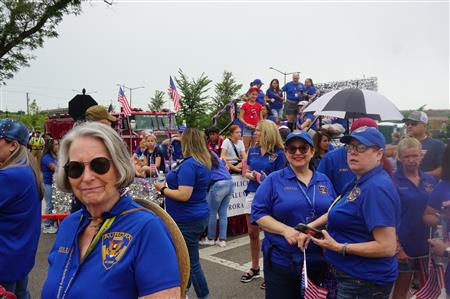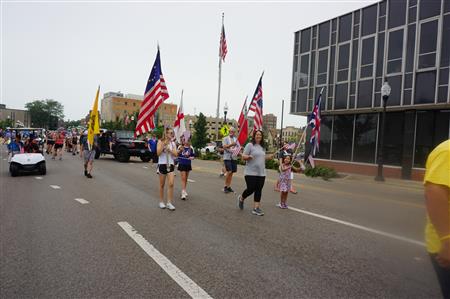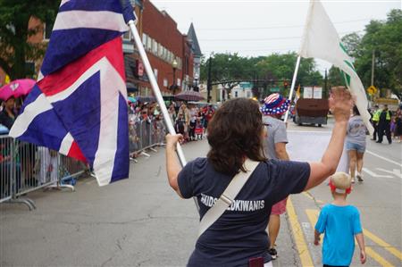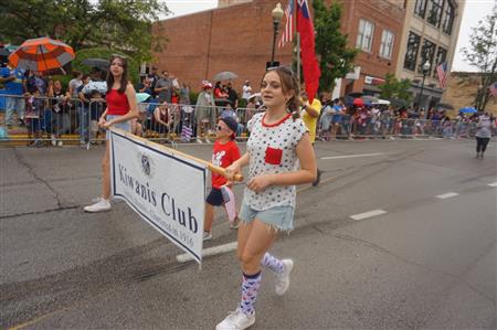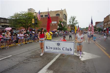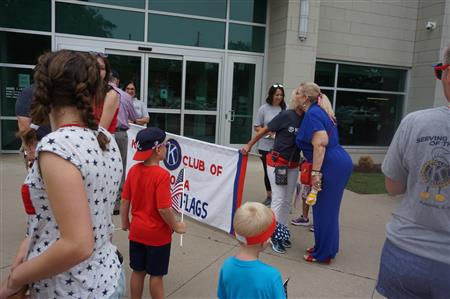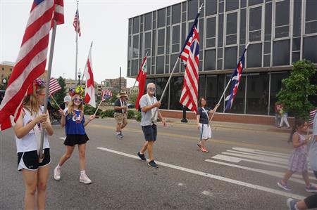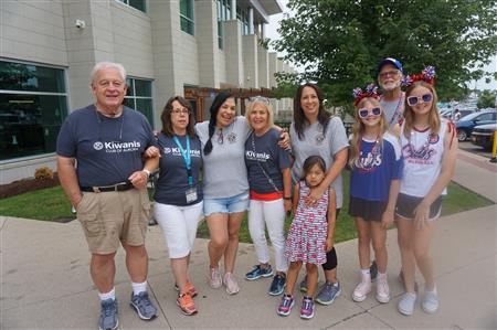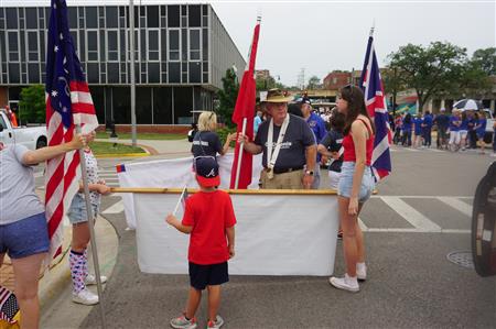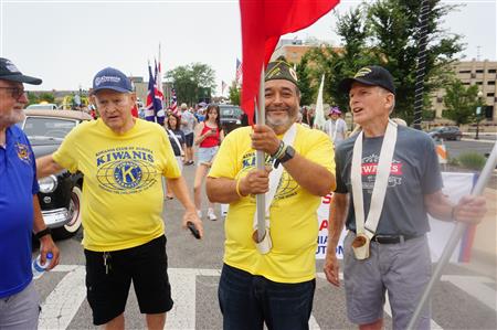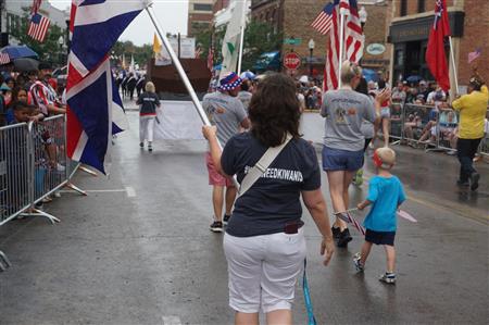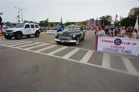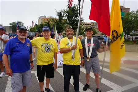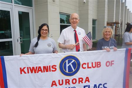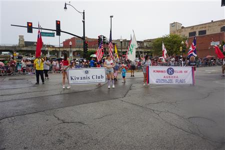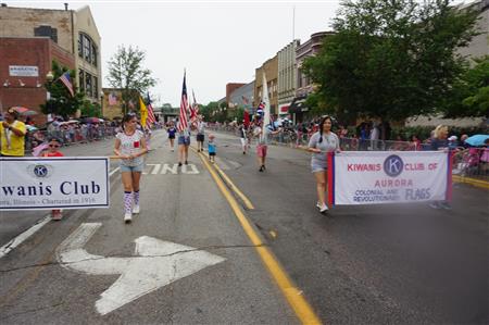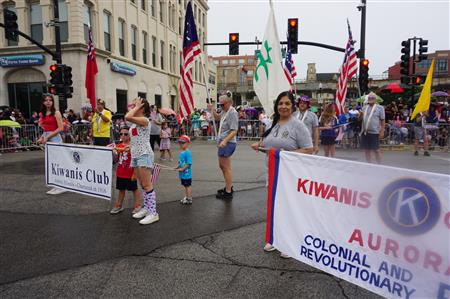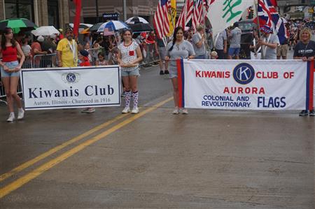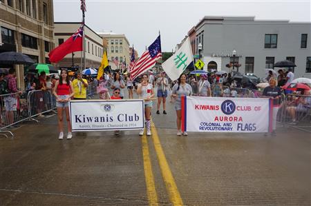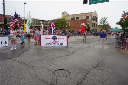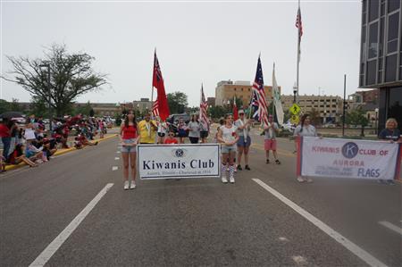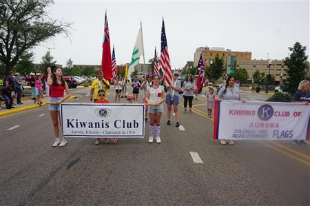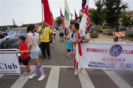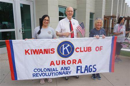 Kiwanis Club of Aurora marching with Colonial flags in Aurora's annual 4th of July Parade. President Christina & other members & friends.