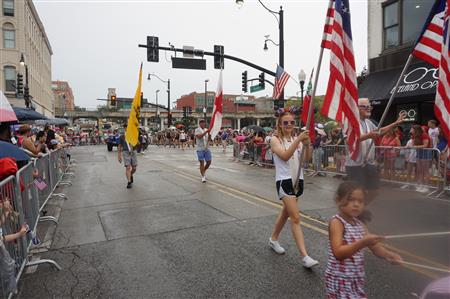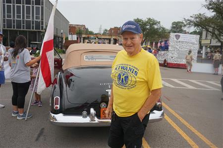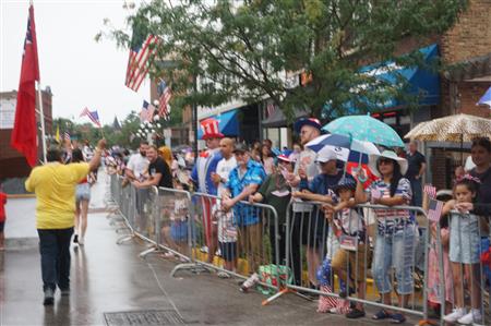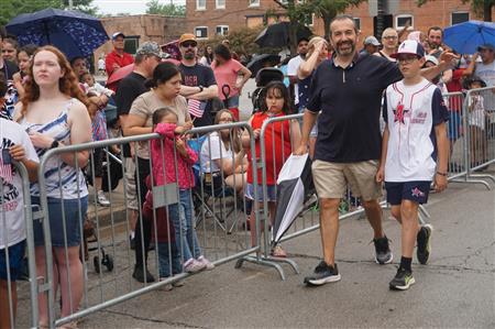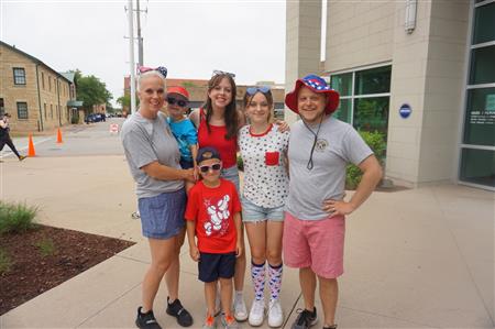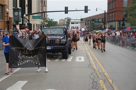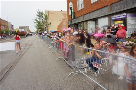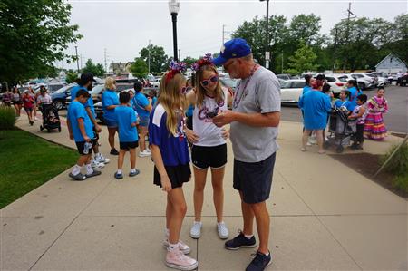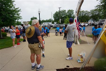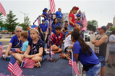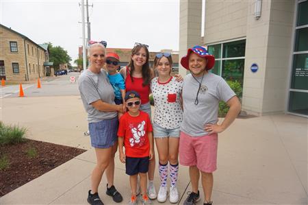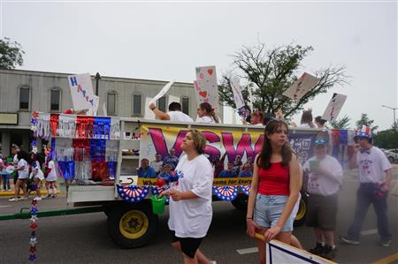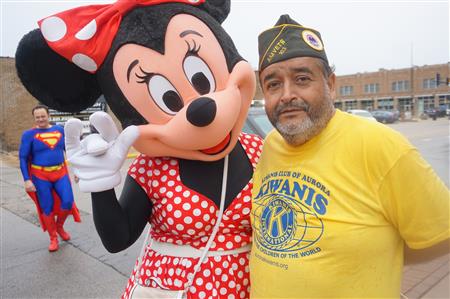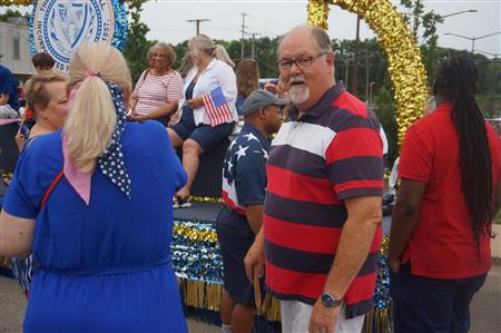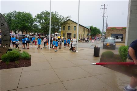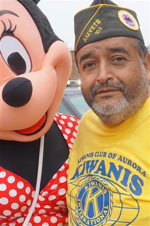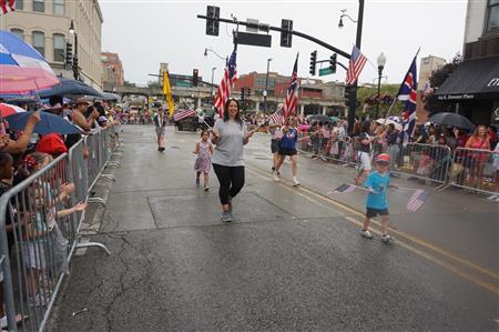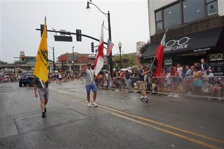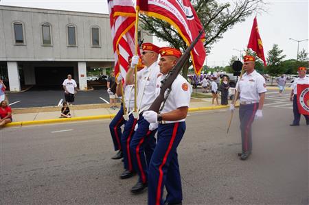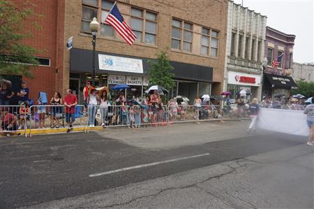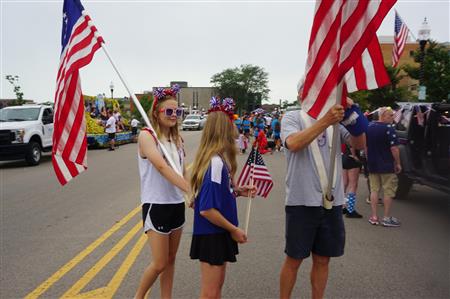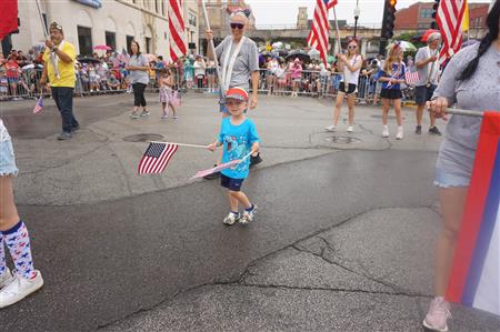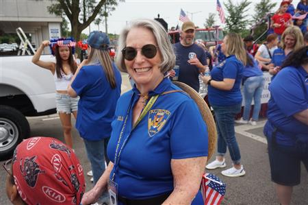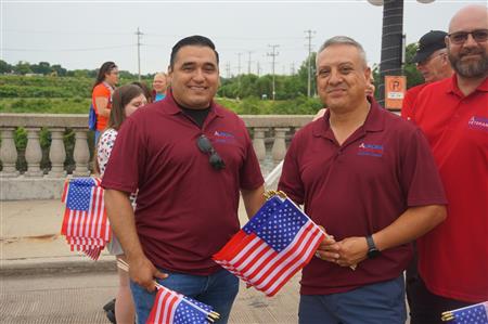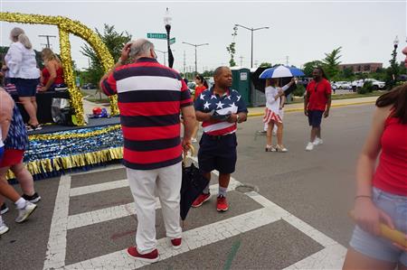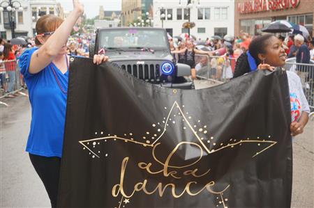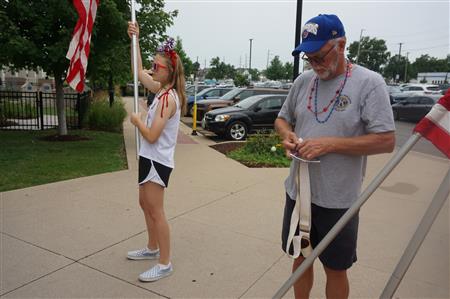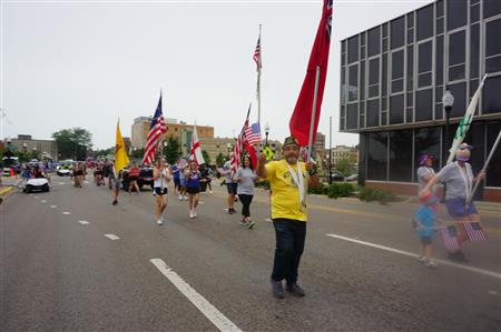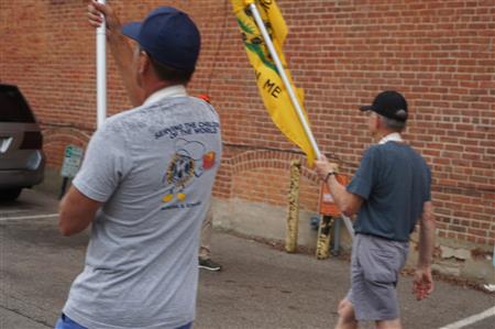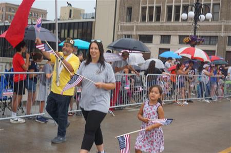Kiwanis Club of Aurora marching with Colonial flags in Aurora's annual 4th of July Parade. President Christina & other members & friends.