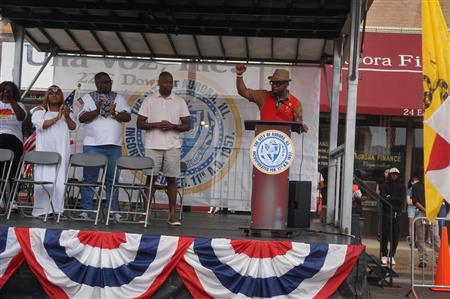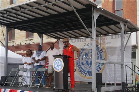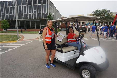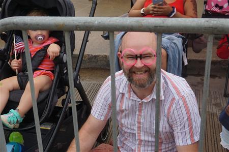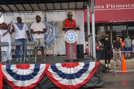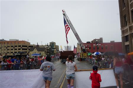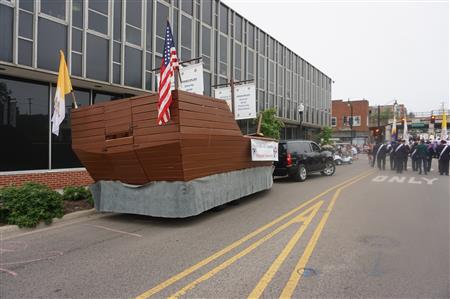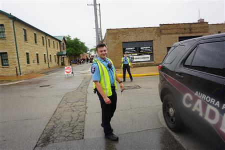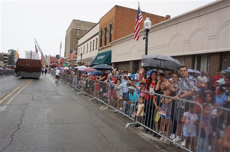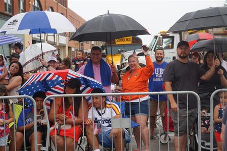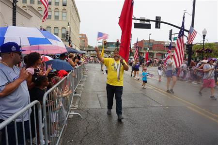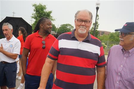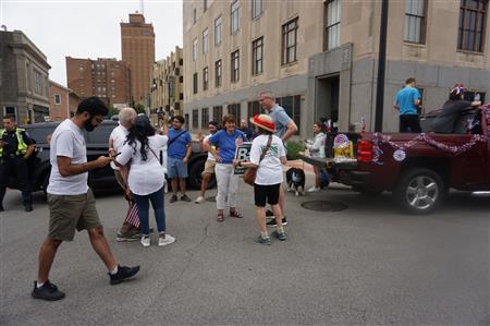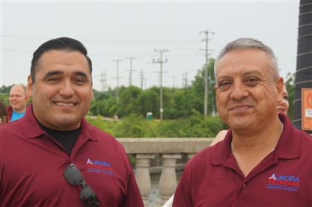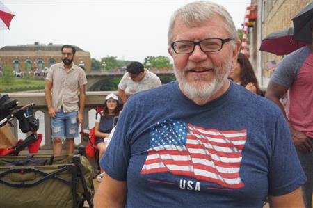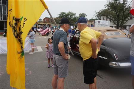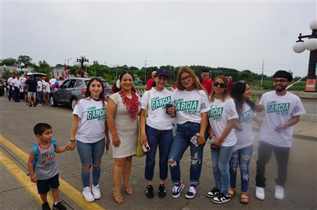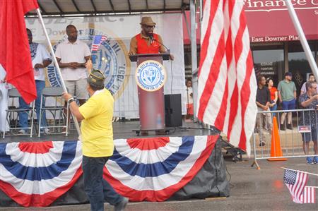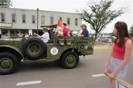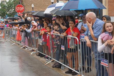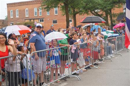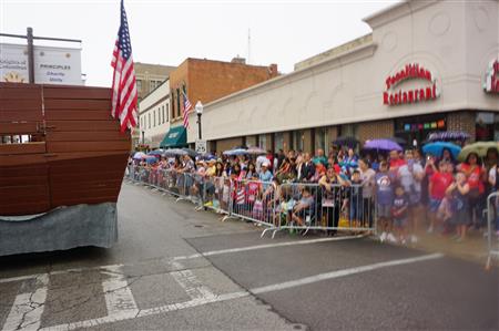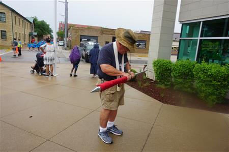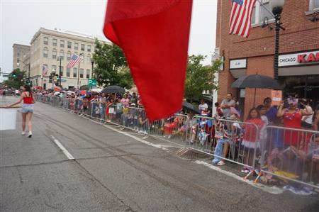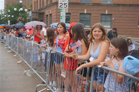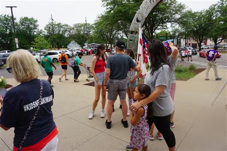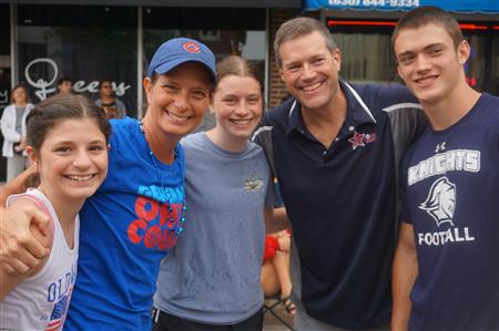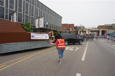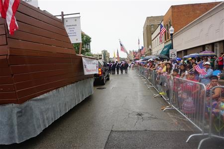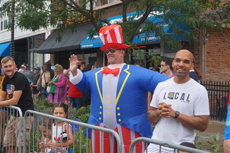 Kiwanis Club of Aurora marching with Colonial flags in Aurora's annual 4th of July Parade. President Christina & other members & friends.