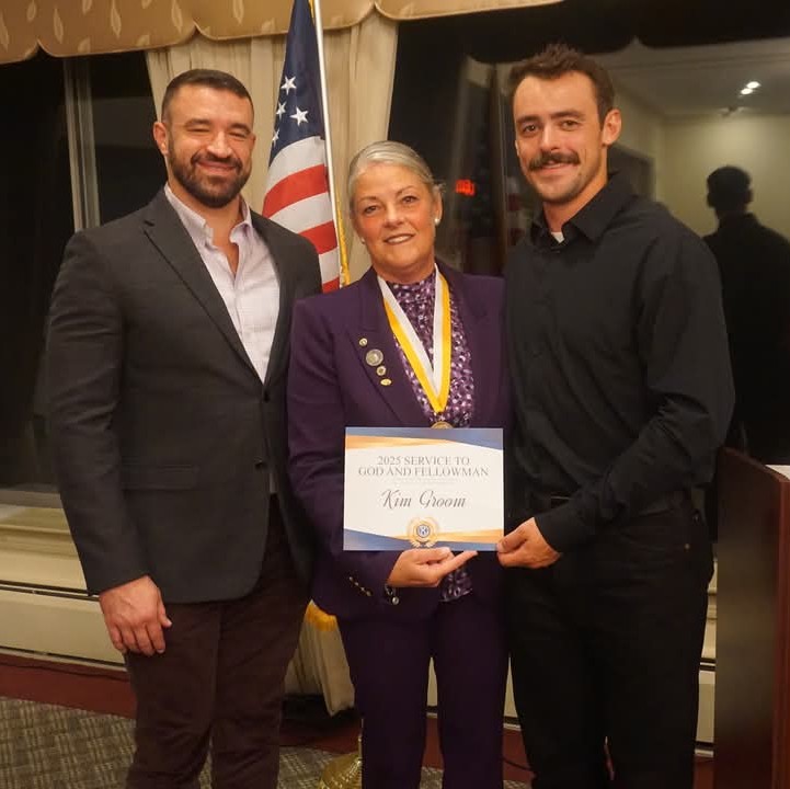 Kim Groom, flanked by her two sons, was the recipient of the distinguished God & Fellow Man Award. Nominated by Denny Wiggins, Kim received her award at the Kiwanis of Aurora Club's 109th Installation dinner September 30, 2025.