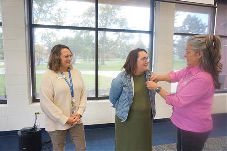 Kim Groom, i-I District Governor, pins new Kiwanis Club of Aurora member Katie Kulakowski, as Michelle Curry Meyer, Division 21 Lt. Governor looks on.
